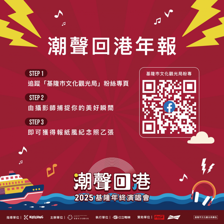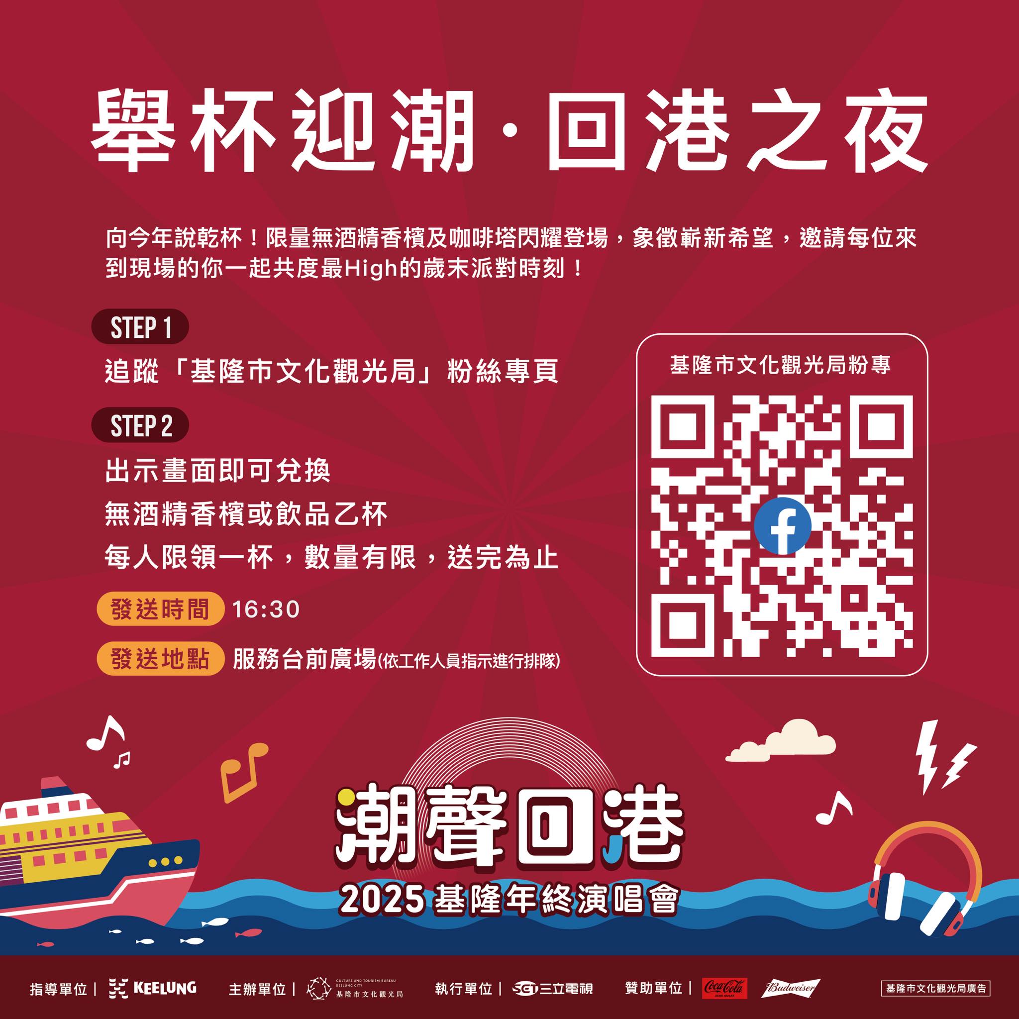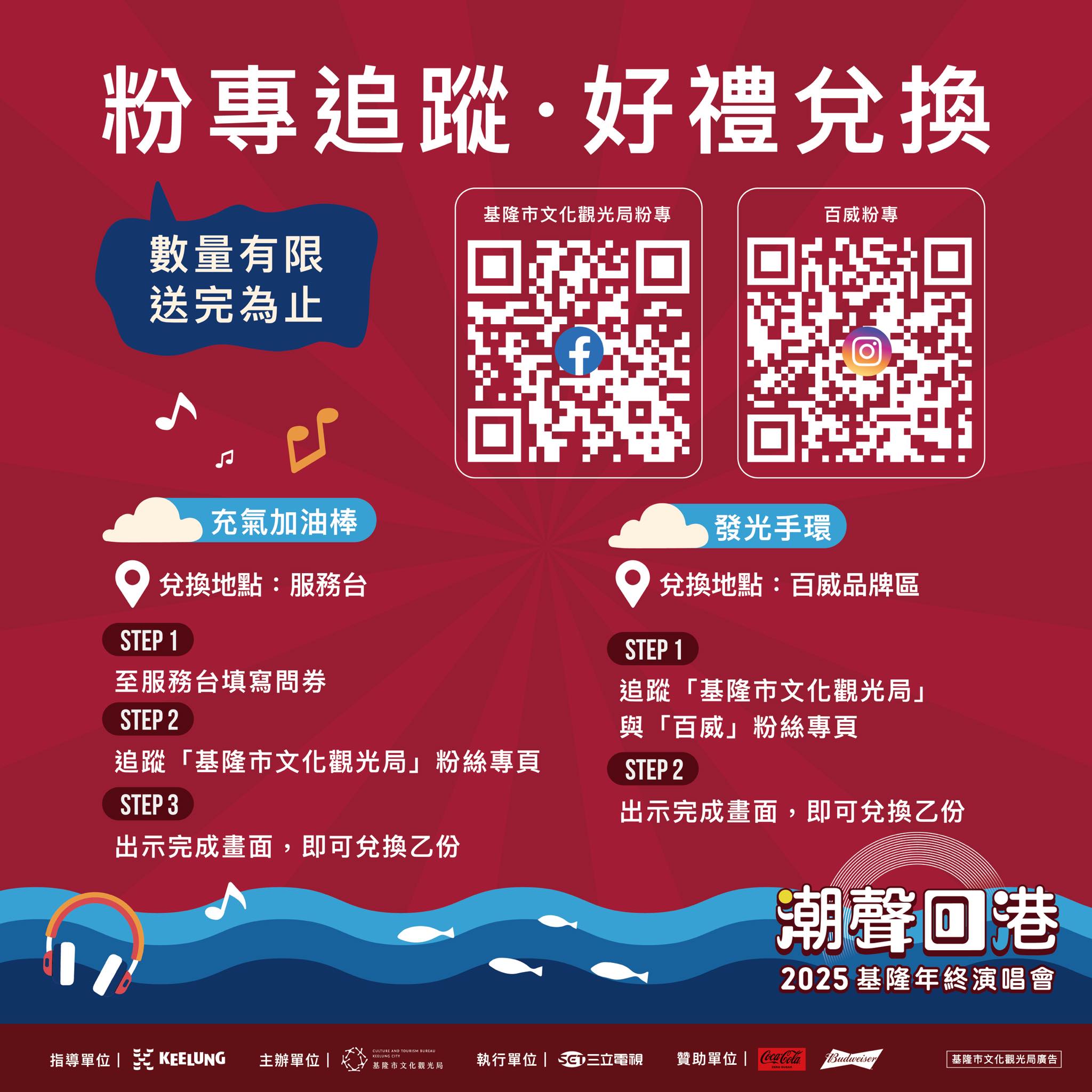 2025 年 12 月 6 日至 12 月 15 日中午 12:00 前按讚基隆文化觀光局FB與活動貼文,tag 兩位好友並留言對基隆的印象,即可參加有抽獎,有機會與年終演唱會藝人合影拍立得 !
