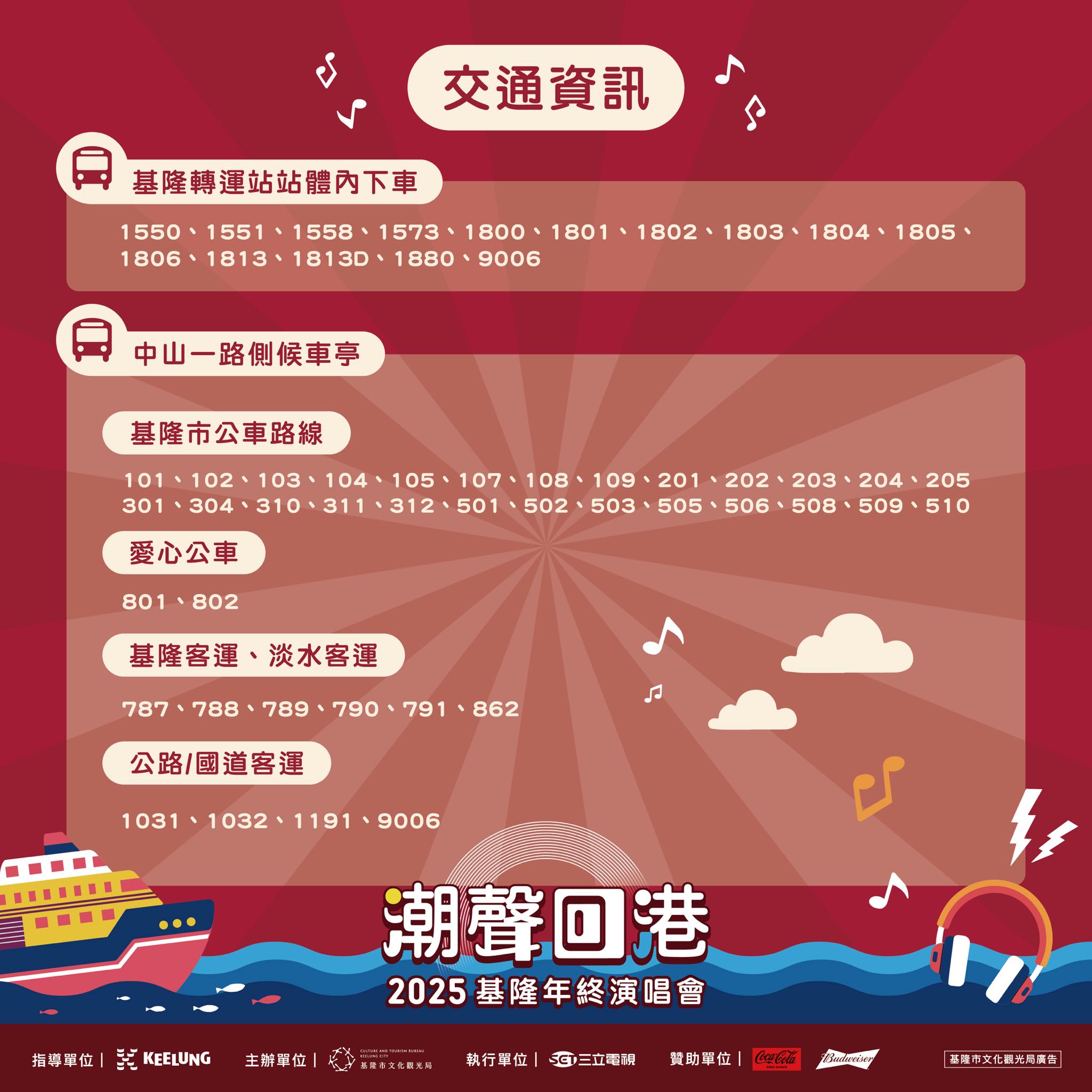 今年基隆年末演唱會在國門廣場舉辦,周邊交通方便,可以搭客運、公車或開車抵達。