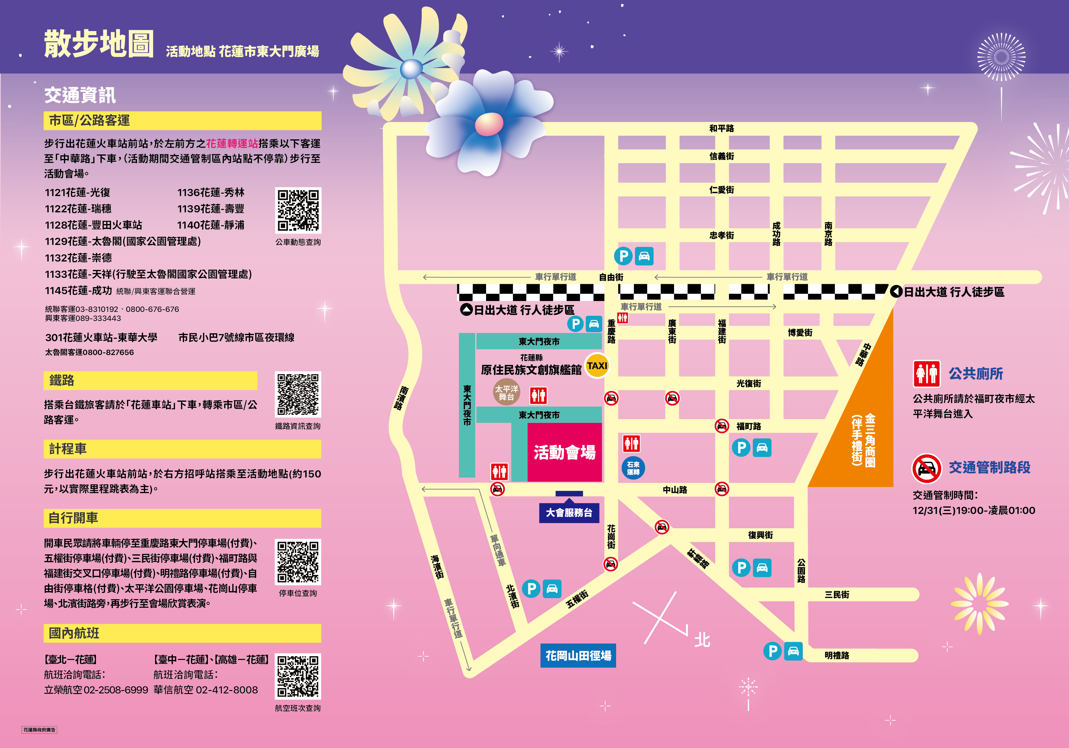 2025/12/31(三)19:00~2026/1/1(四)01:00 花蓮市中山路、重慶路、軒轅路、福町路、花崗街、博愛街、光復街(廣東街至重慶路)將實施交通管制,管制期間禁止車輛通行,周邊公車站取消停靠。