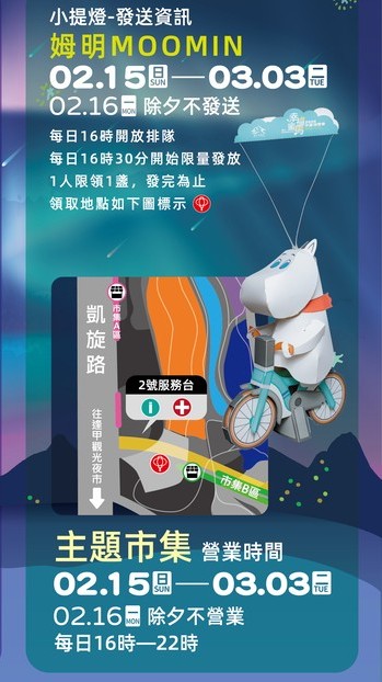 另外 2/7 至中央公園拍下任一姆明裝置,並分享至 FB、IG、Threads 等社群平台或傳 LINE 給親友,即可獲得小提燈一盞 ! 限量 1000 盞送完為止,可於 14:30 起至燈會「河畔奇航」展區排隊,15:00 開始兌換。