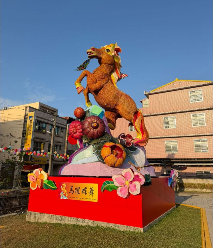 主燈是以生肖馬年為靈感的「馬躍蝶舞」,採用傳統花燈骨架與在地竹編工藝打造,搭配周邊綻放的繽紛花朵與彩色琉璃,既優雅又生動,為本次一大亮點。