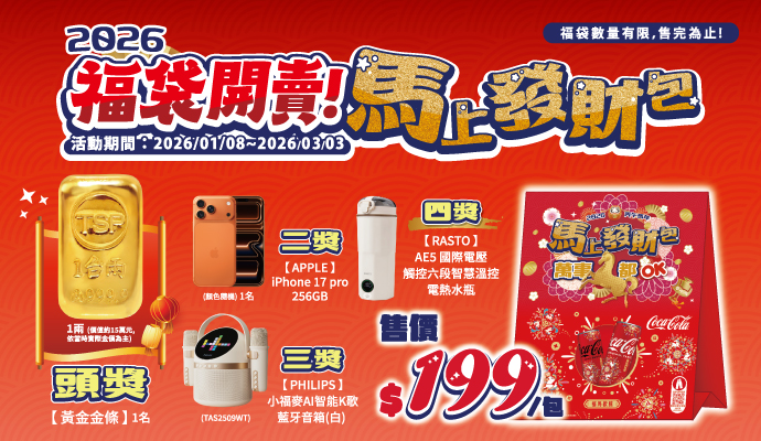 OKmart新春福袋來了,抽獎辦法、內容物、獎項都在這裡 ! OK馬年「馬上發財包」福袋於 2026/1/8 開賣,隨袋附贈刮刮卡,買即可抽最大獎黃金,3C福袋同步登場。想知道福袋哪裡買、獎品有哪些,可見下文整理。