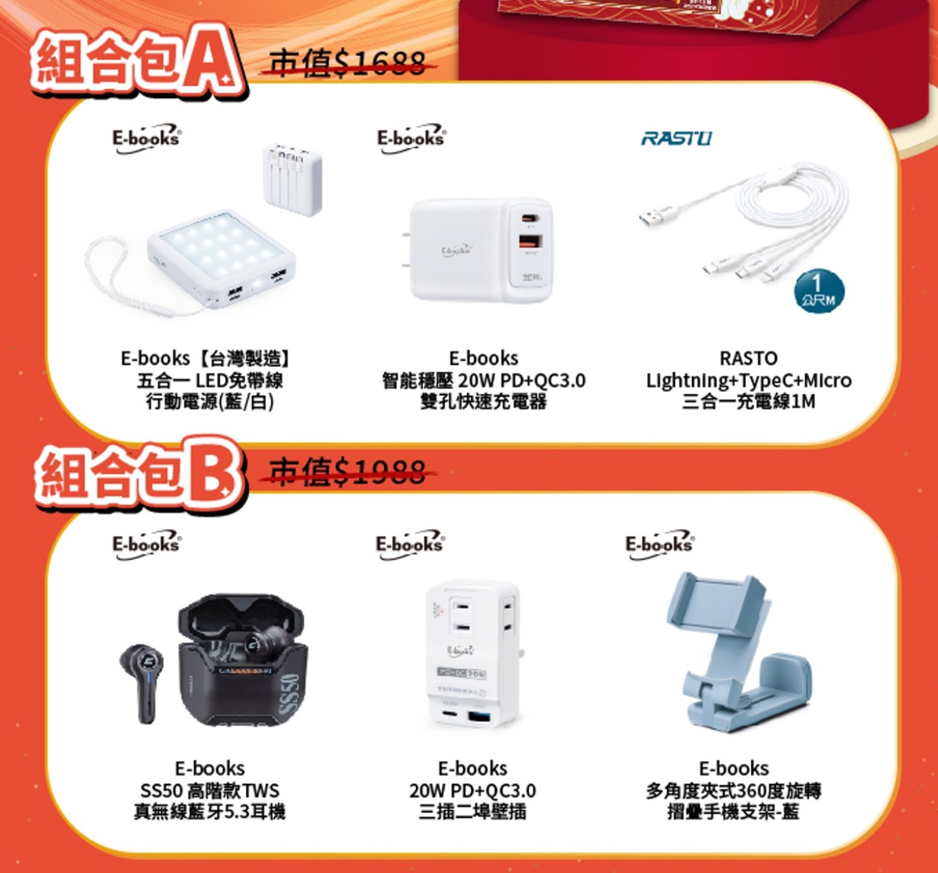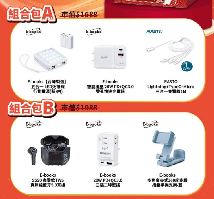 OKmart 金馬3C超值福袋一袋售價 799 元,內容物有價值 1,688 元 3C 產品和 1 張刮刮卡,可隨機獲得行動電源、充電器、三合一充電線、無線藍牙耳機、手機支架、充電座等,2 種組合如下。