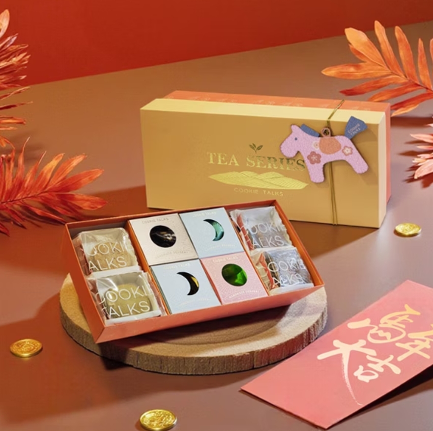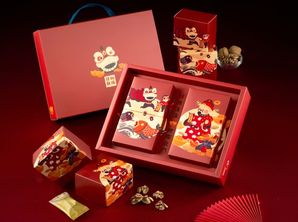 - 特色:雙層新春禮盒,年糖搭配經選手作餅乾,且適合蛋奶素者食用