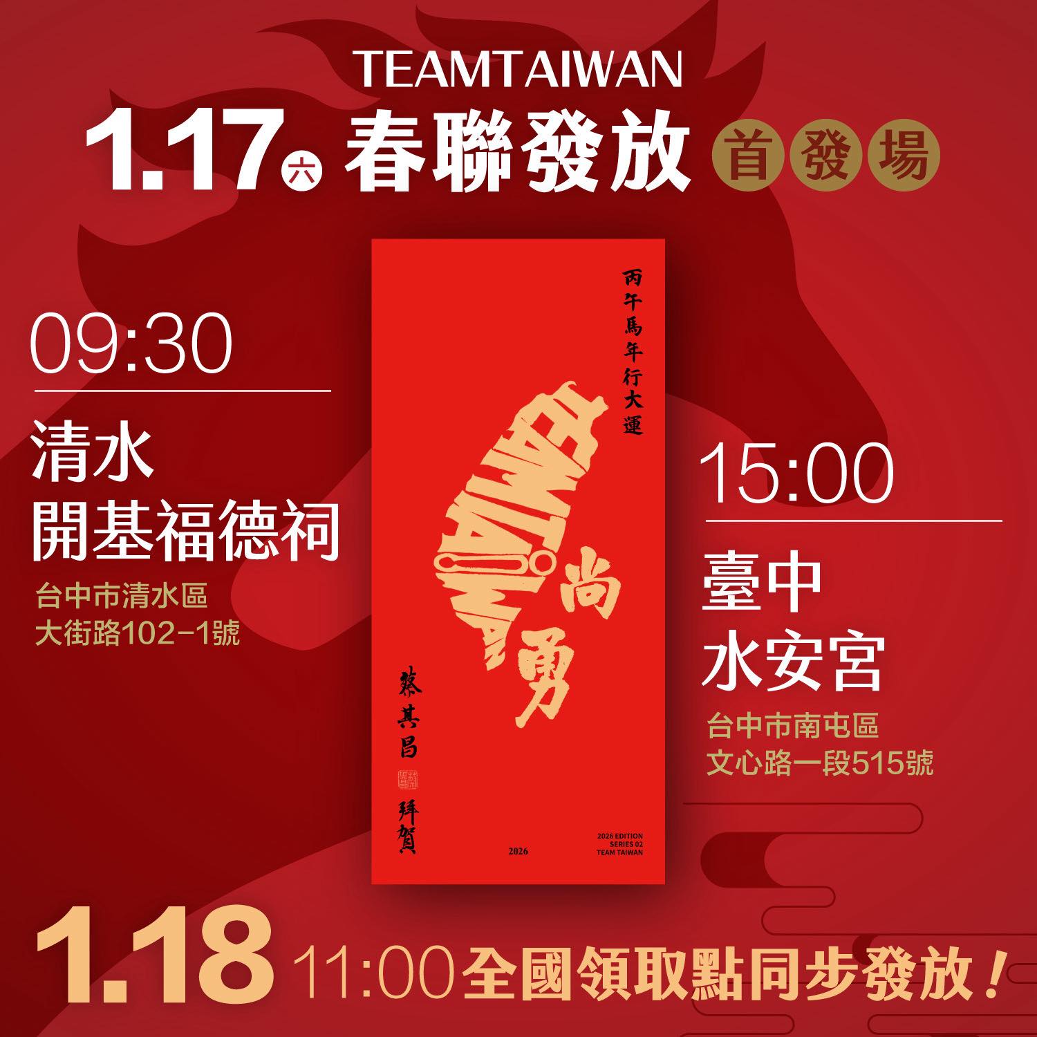 去年中華隊在世界棒球 12 強賽奪冠,立法委員蔡其昌特別印製「台灣尚勇」春聯,供民眾自由領取;今年再推出 2026 年限定版「Team Taiwan 尚勇」,結合新春喜氣與英文字組成的台灣造型,期許大家面對挑戰都能如台灣隊氣勢如虹。