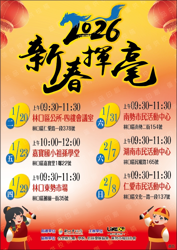 今年新北市林口區公所規劃了 6 場新春活動,將邀請書法界名家與彩墨大師到場揮毫,並免費致贈七字春聯與彩墨作品。其中首場更有人瑞沈軏先生會來到現場,一同開箱這次馬年新春對聯。