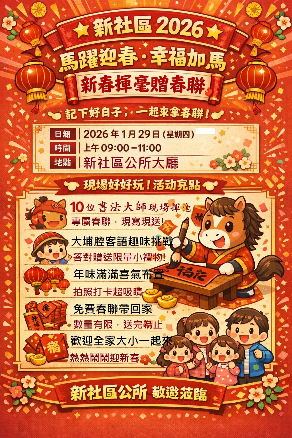 馬年到來,台中市將在新社區公所大廳辦理新春揮毫活動,邀請 10 位書法大師到場寫春聯。除了可以來把免費春聯帶回家,答對客語趣味挑戰還可獲得小禮物 ! 現場也有充滿年節氛圍的佈置,讓大家提前感受過年氣氛。