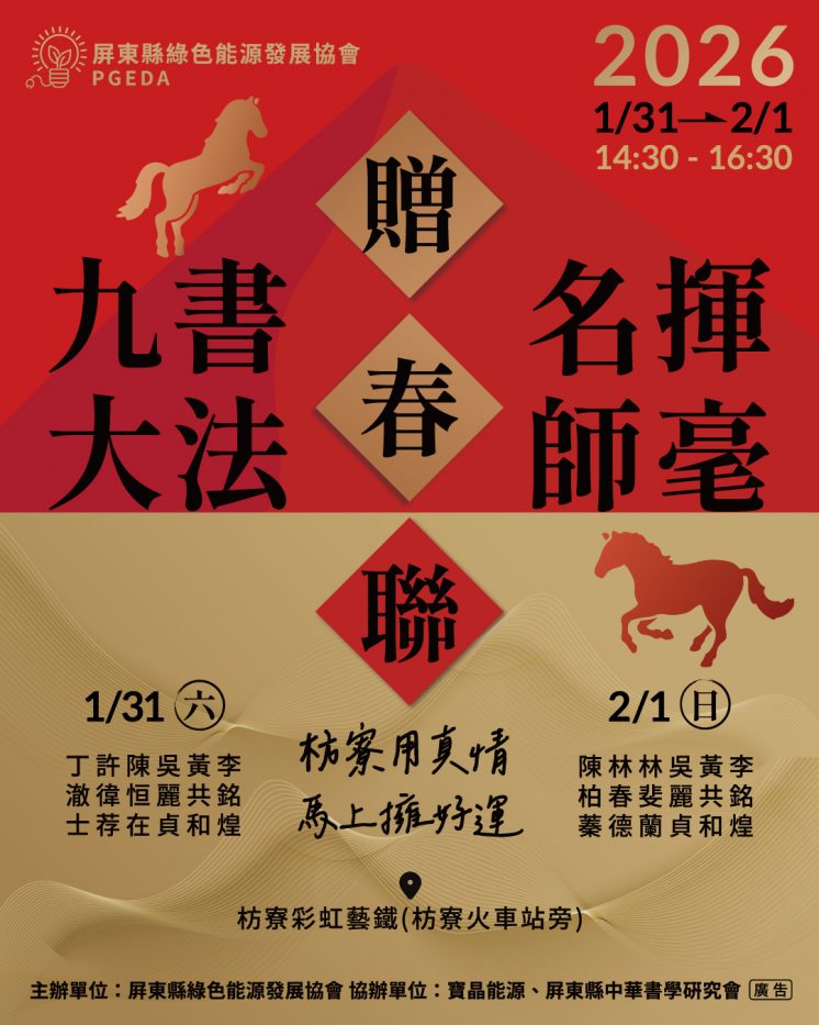 屏東綠色能源發展協會今年邀請 9 位書法名師,將辦理兩日揮毫贈春聯活動,送新年好運給鄉親們。欲領取的朋友,可至枋寮火車站旁枋寮彩虹藝鐵。