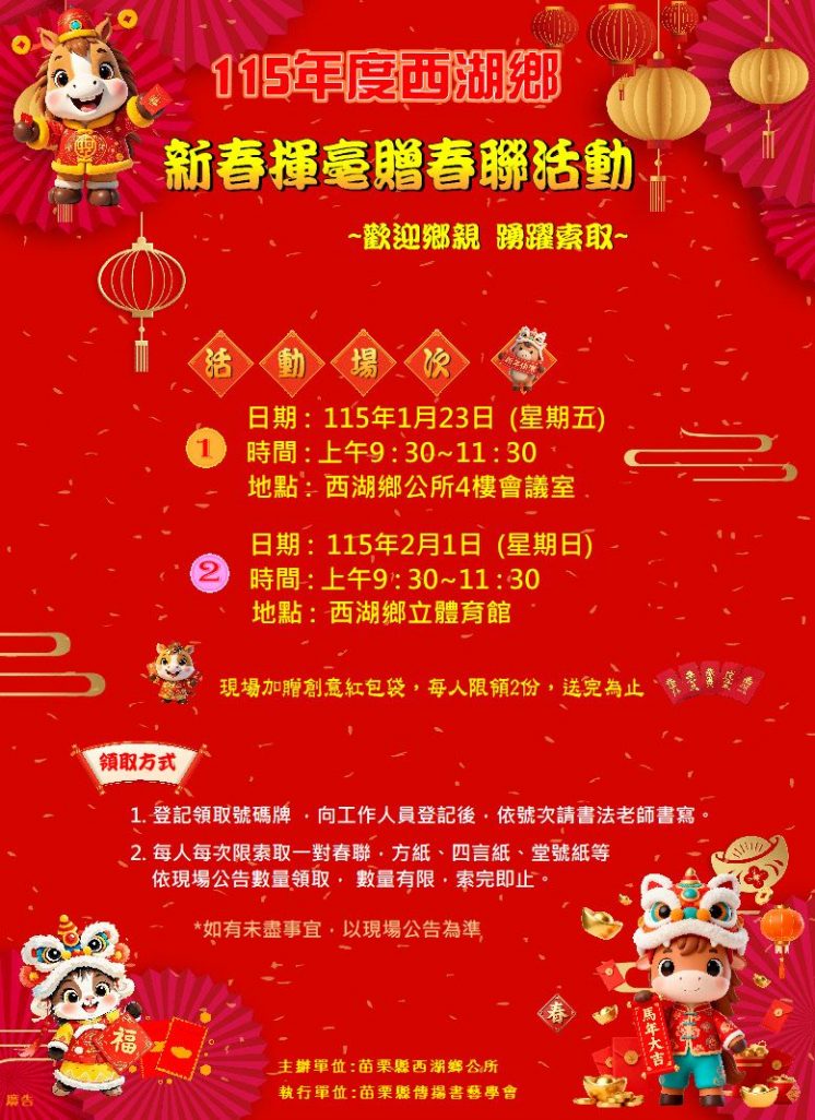 為增添年節喜氣,苗栗縣西湖鄉公所將舉辦 2 場新春揮毫贈春聯活動,除了供鄉親免費領取春聯,還加贈創意紅包袋 !