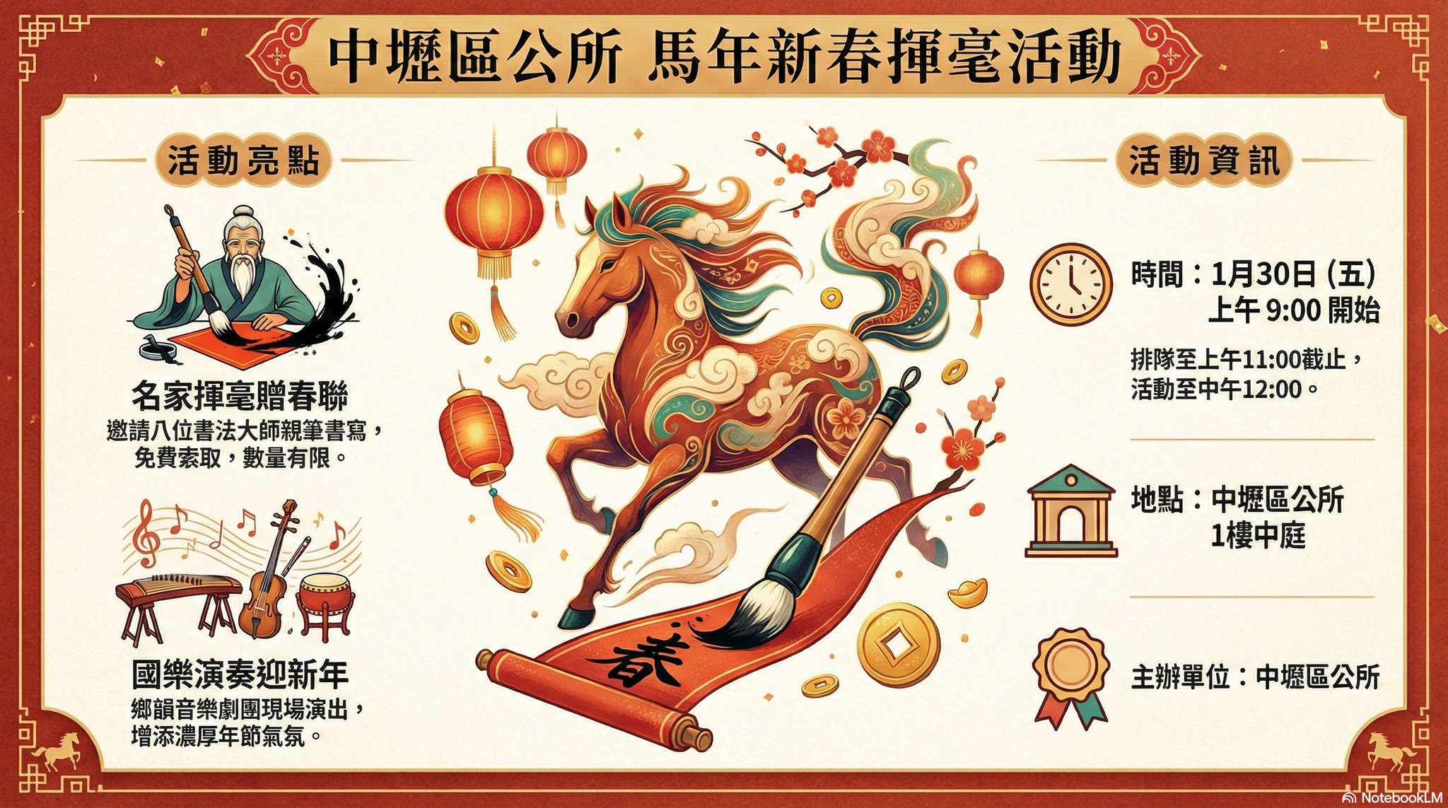 桃園也有免費送春聯活動 ! 中壢區將在 1 月 30 日舉辦 115 年馬年新春揮毫,邀請 8 位書法家親筆書寫春聯,並有國樂劇團演奏,迎春納福。打算領春聯的朋友,可於當天 9 點開始到場排隊。
