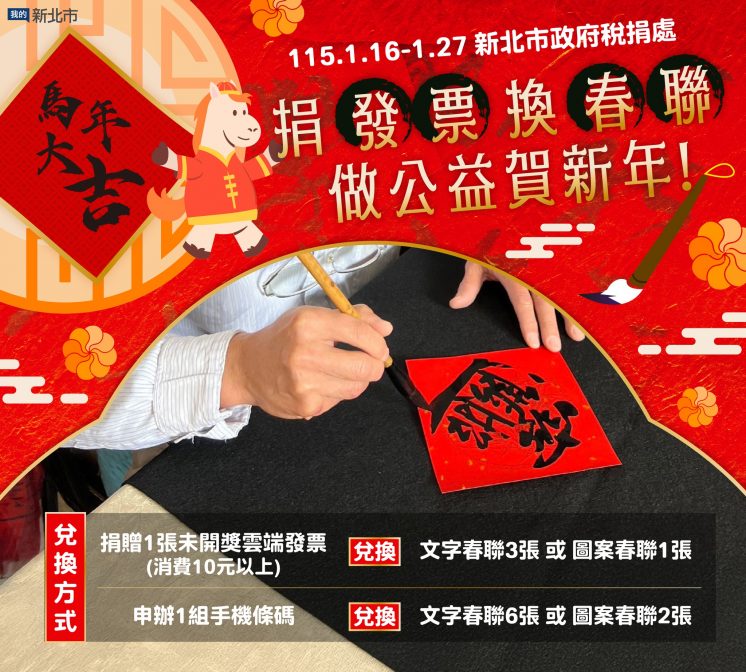 新北市政府每年推出捐發票換春聯活動,邀請大家一起做公益,今年活動於 1/16~1/27 展開 ! 現在只要於名家揮毫迎新春活動期間,至現場捐贈 1 張未開獎、消費 10 元以上的雲端發票,即可免費兌換 3 張純文字春聯或 1 張有圖案春聯;申辦 1 組手機條碼,可享上述兩倍兌換數量。