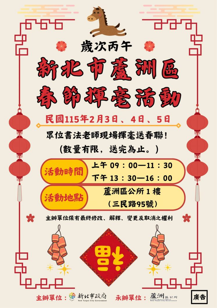 新北市將在蘆洲區公所一樓大廳舉辦 3 日春節揮毫活動,請多位書法老師前來送春聯。準備過新年的鄉親,可直接到現場領取;數量有限,送完為止。