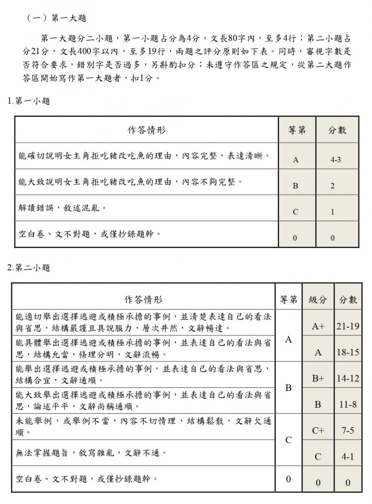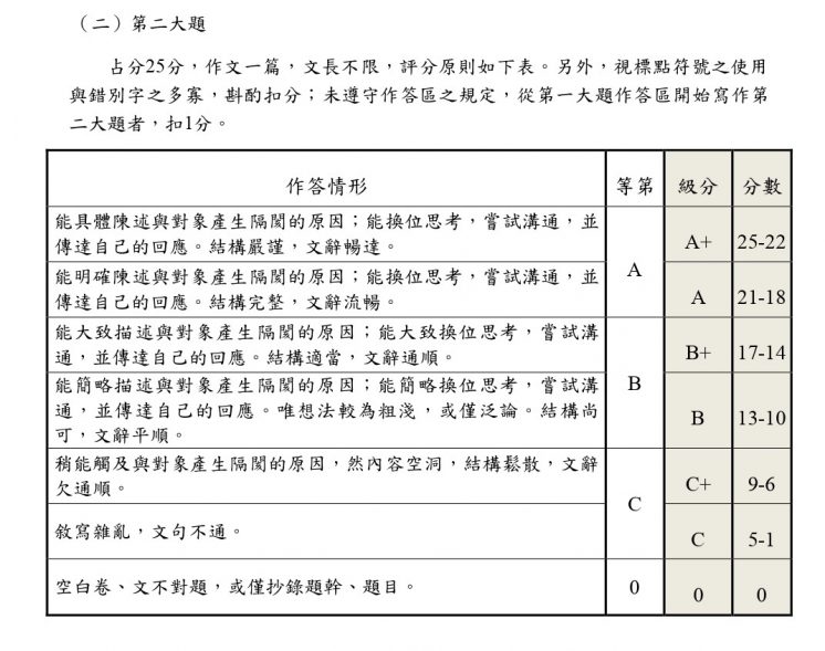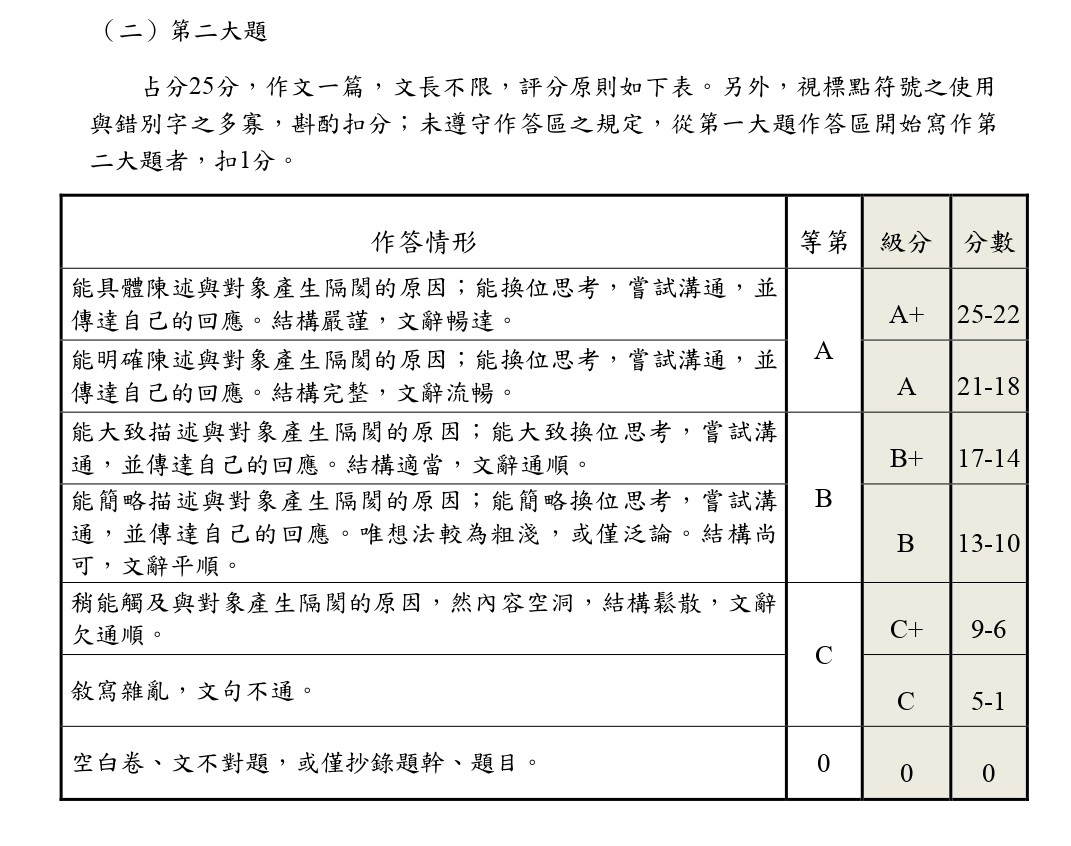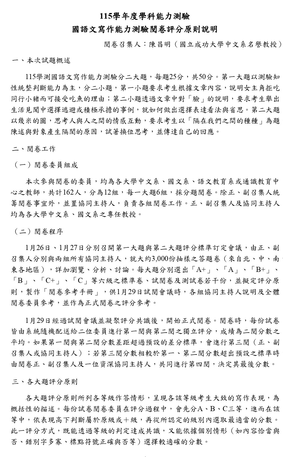 115學年度學測國文手寫題答案、評分原則與給分標準已公告,如下。