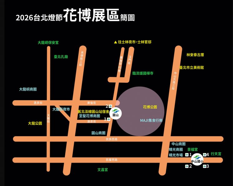 另外如果是兩個燈會展區都想逛的朋友,官方推薦大家可以搭乘 218、260、310、304(承德)、202 直達公車,可輕鬆往返「捷運圓山站」和「捷運西門站/中華路北站」,乘車時間約 20 到 30 分鐘。