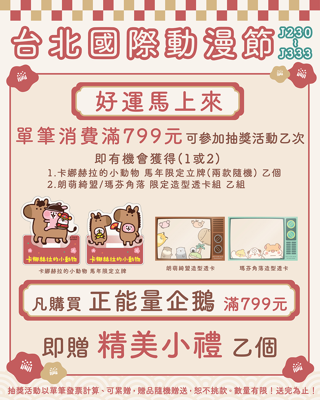 喜歡吉伊卡哇、卡娜赫拉的朋友看這裡 ! 迎接新年到來,三貝多推多項限定商品,包括吉伊卡哇絨毛娃娃,日本正能量企鵝新品吊飾、環保購物袋,還有「 瑪芬角落」首次來到動漫節,快來把他們帶回家~單筆消費滿 799 元即可參加抽獎活動一次,有機會獲得馬年立牌、造型透卡 !