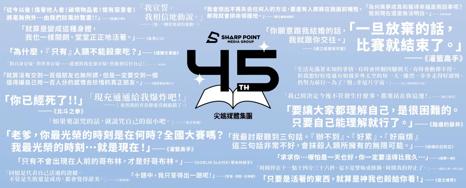 逢尖端出版社 45 週年,這次在動漫節特別推出「加碼現金折」活動,滿 500 元現折 45 元 ! 今年更首度設置「驚喜抽卡機」,有機會抽中知名漫畫家、插畫家的創意卡圖,憑滿 1000 元發票即可免費玩。現場還設有「經典動漫名言牆」,讓大家一同重溫感動台詞。