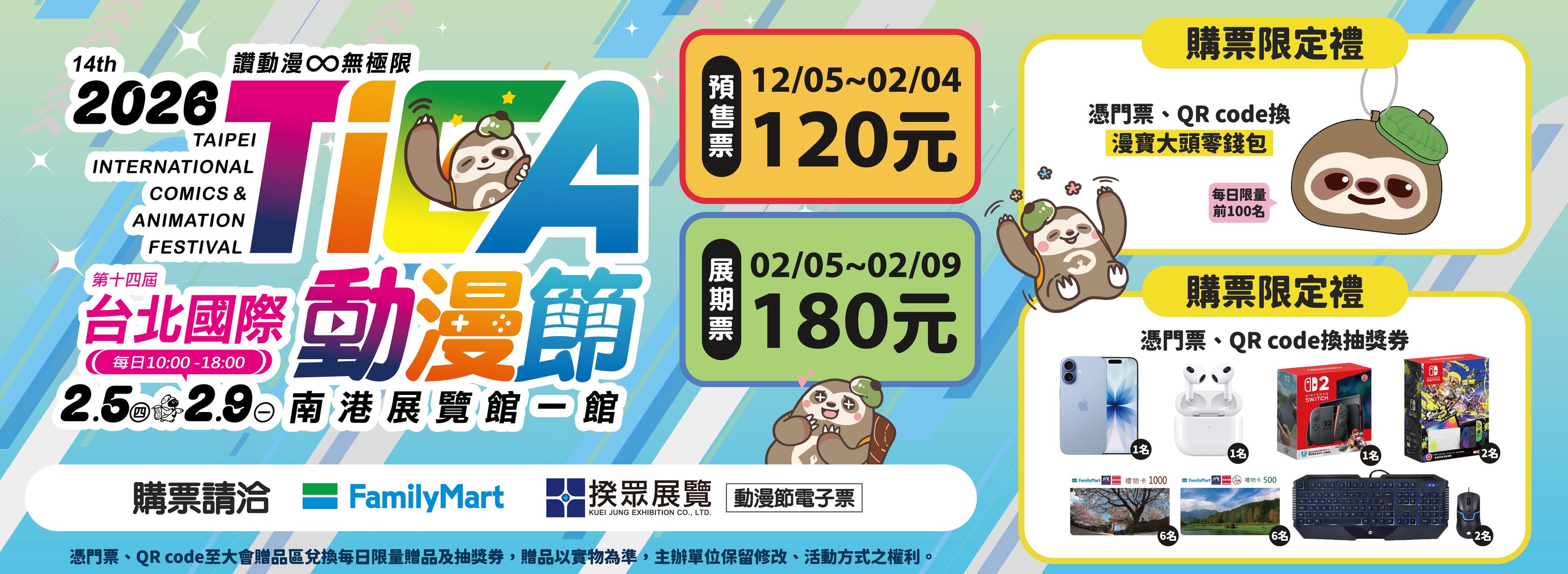 台北國際動漫節採兩階段售票,第一階段預售於 12 月 5 日至 2026 年 2 月 4 日販售,第二階段將於 2 月 5 日至 2 月 9 日開賣,現場票價是 180 元,展覽現場、線上皆能購得。