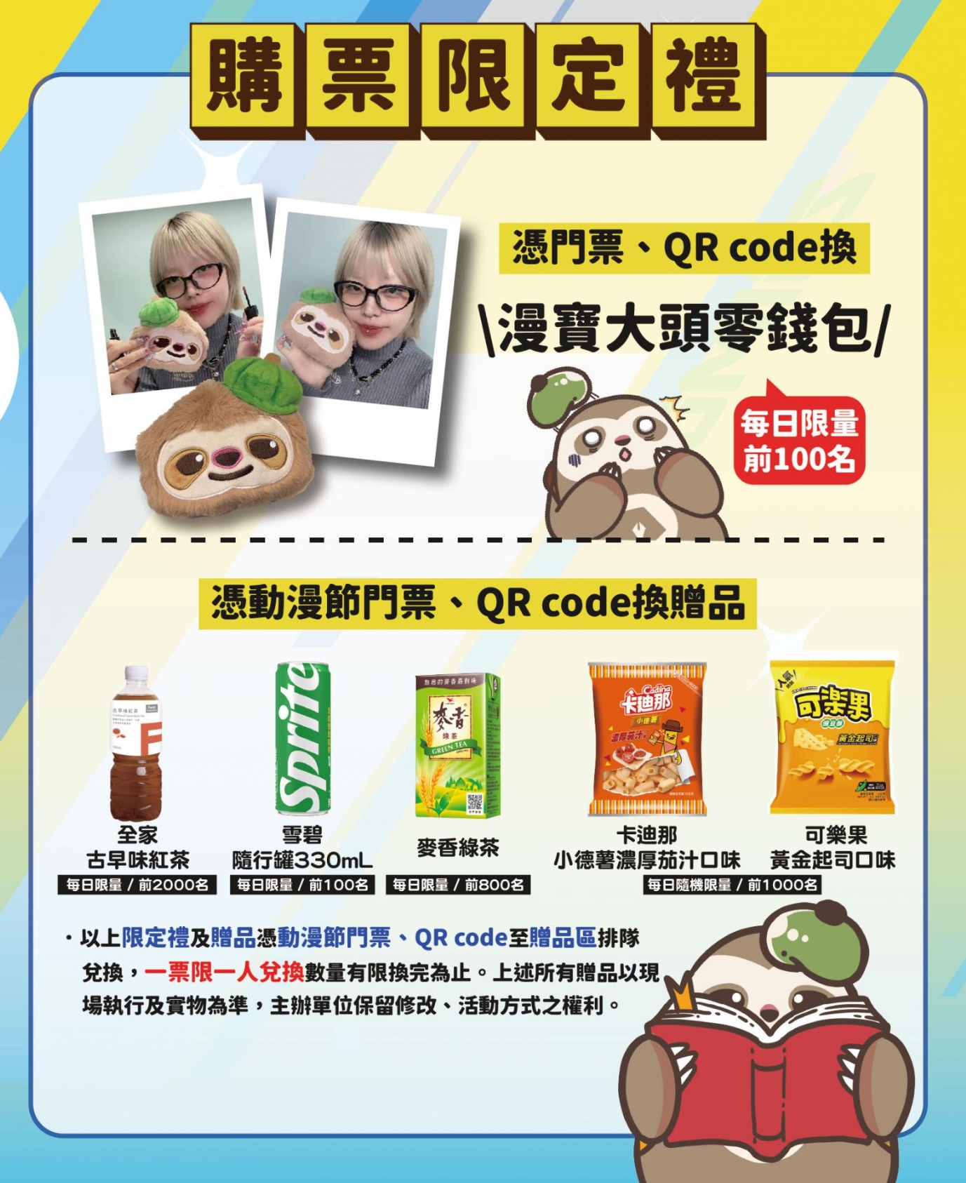 憑門票、電子票 QR Code 可以獲得限定禮品「漫寶大頭零錢包」,每日限量 100 名 ! 另可換全家古早味紅茶、雪碧隨行罐、麥香綠茶、卡迪那茄汁口味、可樂果等零食或飲料,一票限一人兌換,送完為止。