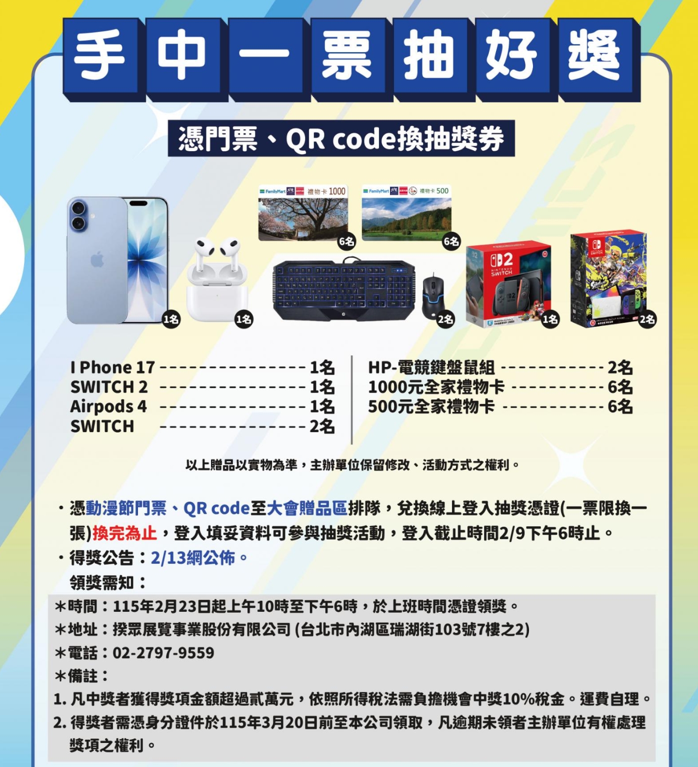 另外憑台北國際動漫節門票,還可以抽手機 iPhone17、Aairpods 4、任天堂 SWITCH 2、全家禮物卡 1000 元、HP電競鍵盤滑鼠組等 3C 遊戲好禮 ! 欲參加的朋友,記得於 2/9 下午 6 點前上網登入抽獎憑證。