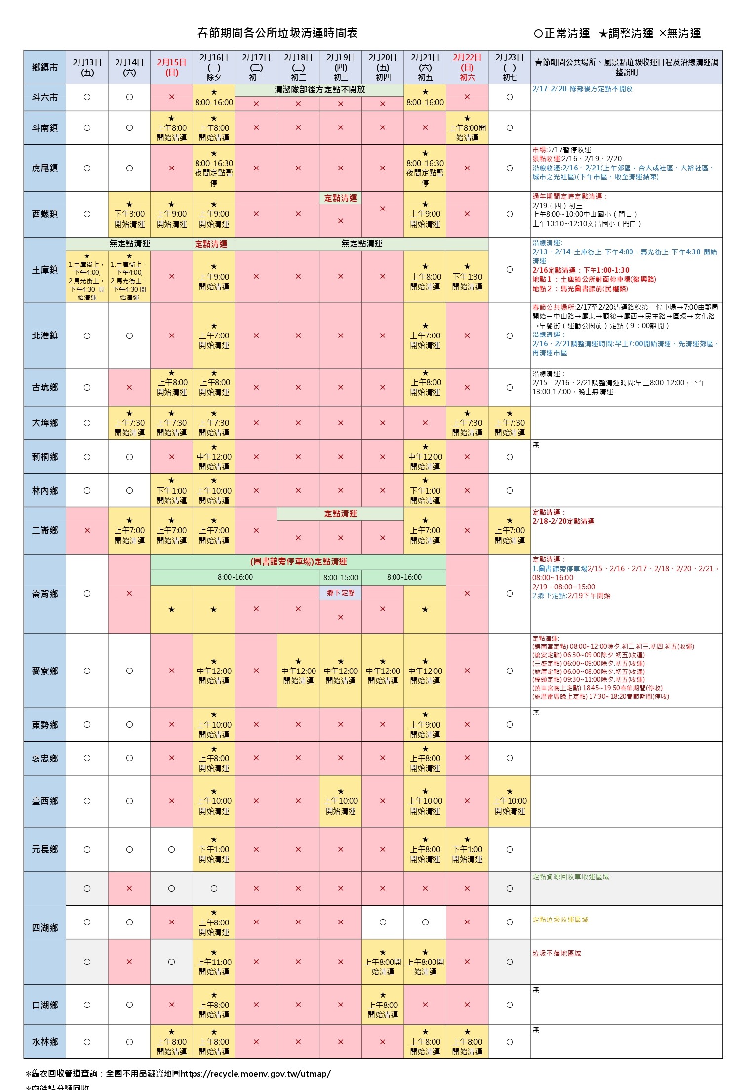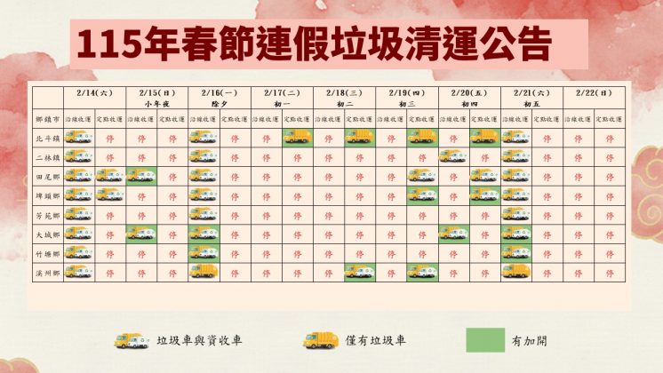 | 春節垃圾車 | 依各鄉鎮公告 | 2/17(二)~2/19(四) 初一至初三 2/21(六)初五 | 依各鄉鎮 |