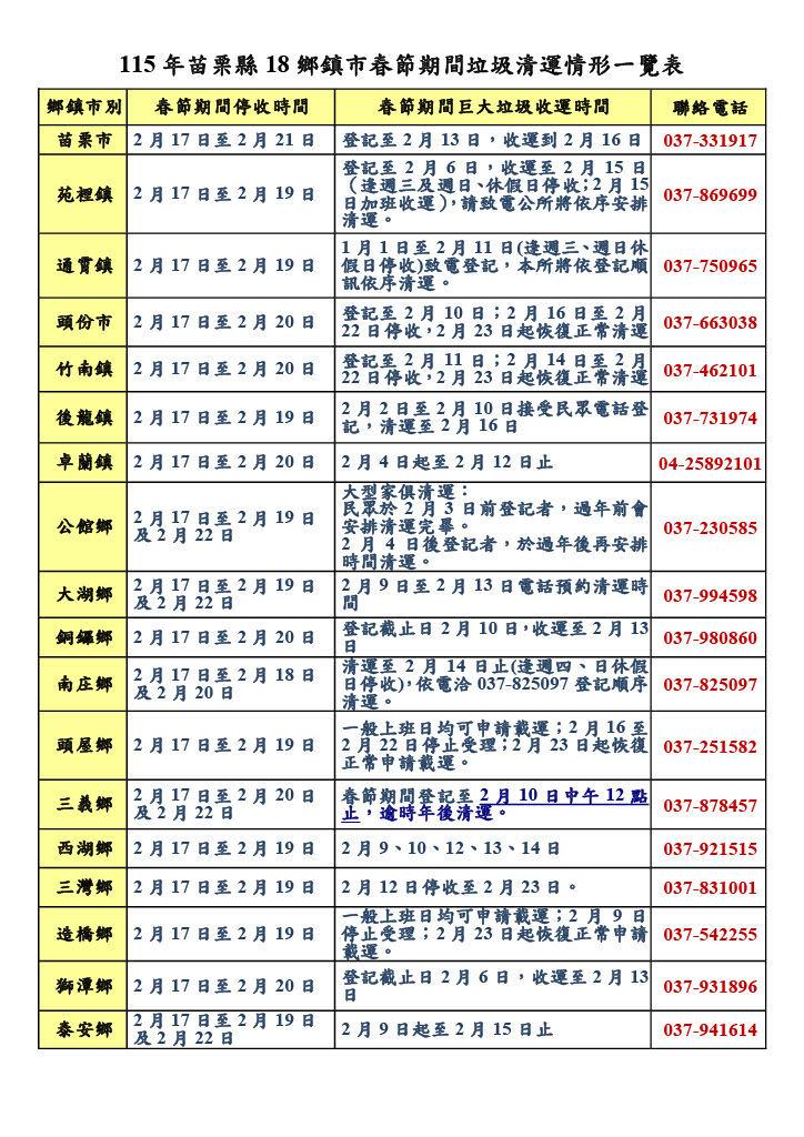 | 五峰鄉 | 其餘假期期間 土場清泉線: 2/16(一)除夕、2/20(五) 雪霸線: 2/20(五)初四 白蘭線: 2/21(六)初五 | 前山: 2/14~2/19 後山: 2/17~2/19 | 全年可提出申請,節前後1週暫停清運 |