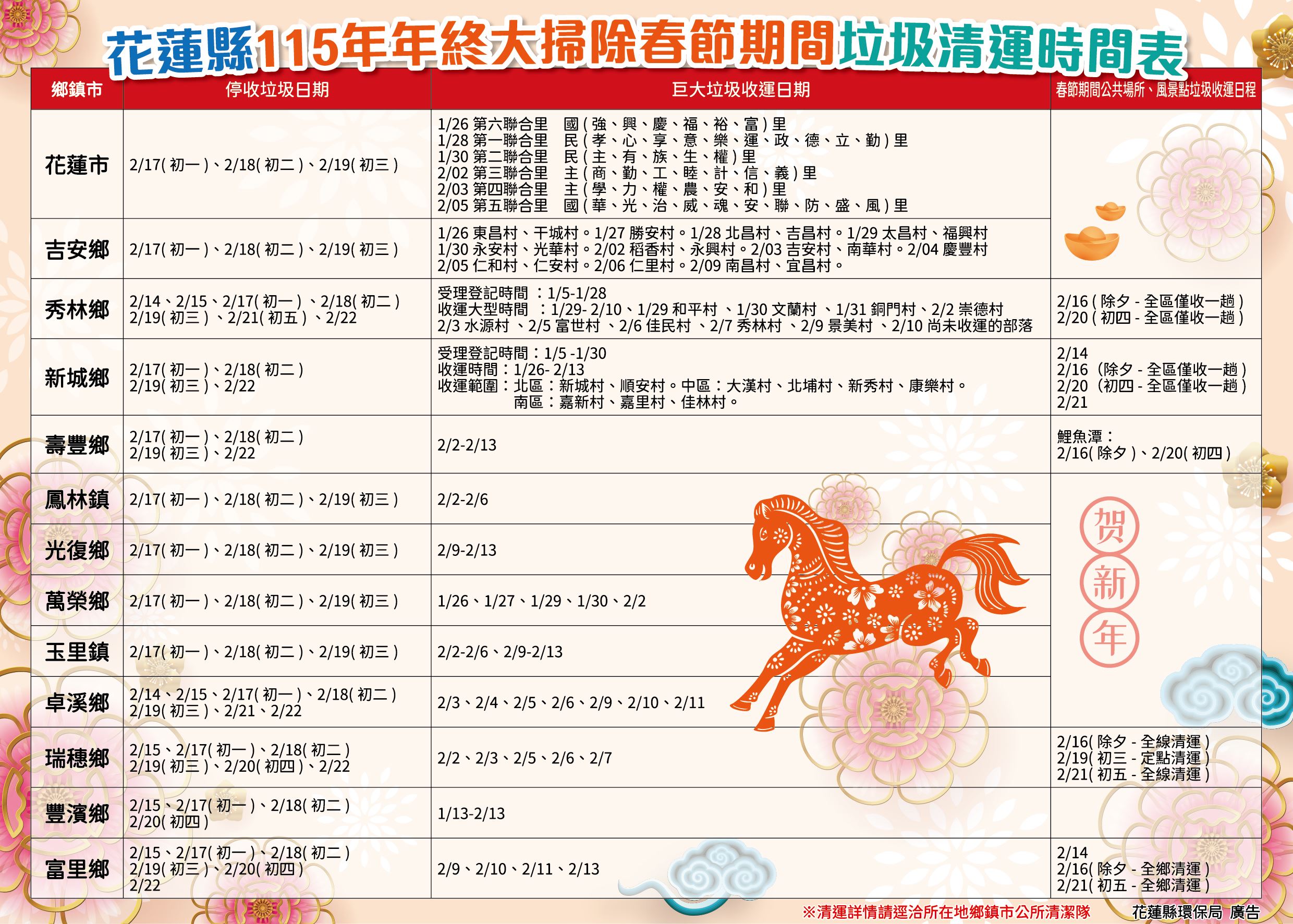 | 花蓮縣過年垃圾車 (115年) | 收垃圾時間 | 停收時間 | 大型垃圾清運 |