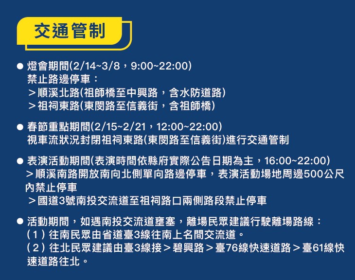 2/14~3/8 09:00~22:00,順溪北路(祖師橋至中興路)、祖祠東路(東閔路至信義街,含祖師橋)配合活動進行交通管制,禁止路邊停車。