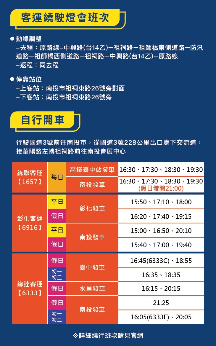 | 南投燈會客運 | 發車地點 | 行駛日 | 發車時間 |
