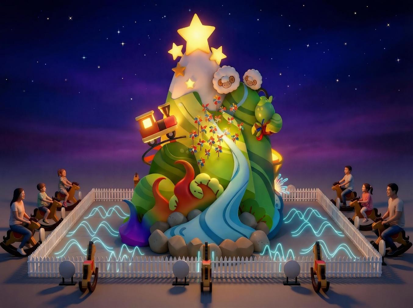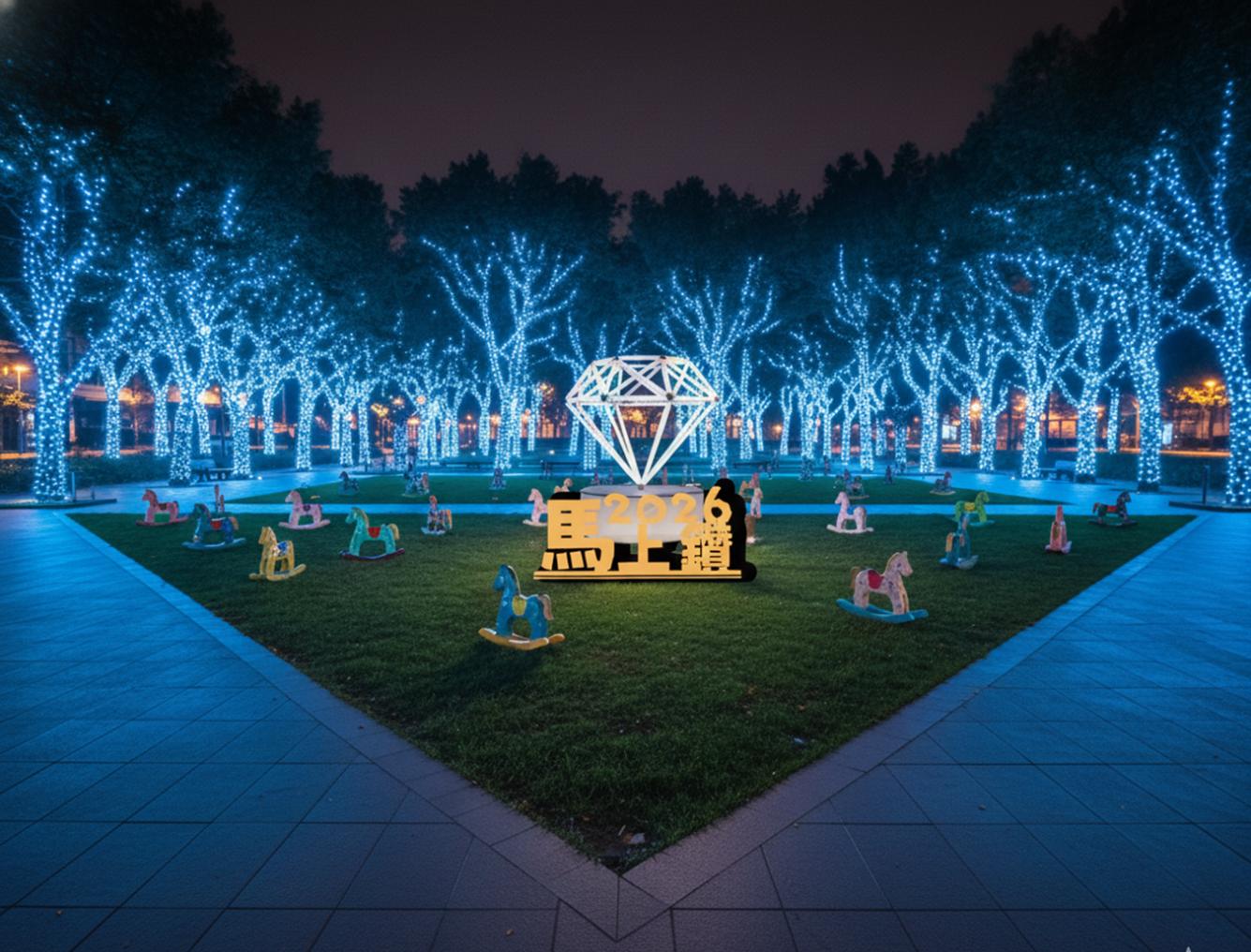 另一座位於地面的「飛馳樂園」主燈則是向 2014 年的台灣燈會主燈致敬,運用銀白金屬將其重新詮釋,與周圍繽紛燈光和彩繪小馬創造夢幻樂園景象。