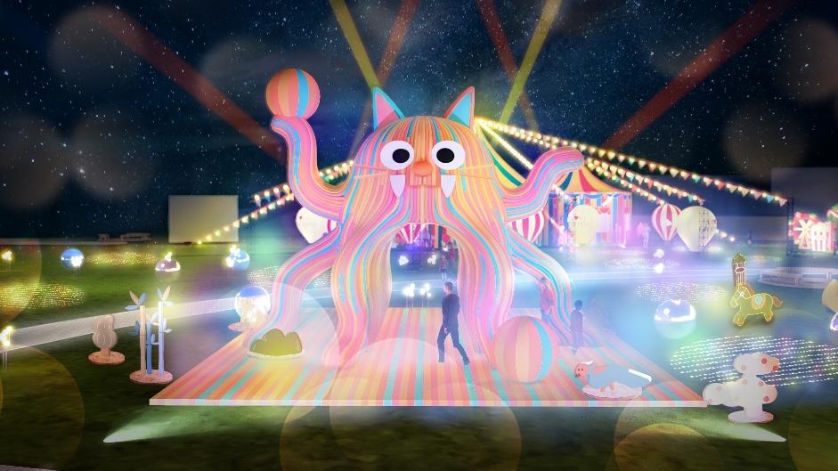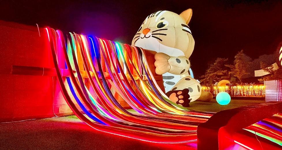 2026 南投燈會共有 11 個燈區,除了反應過激的貓,這次更融入馬戲元素與大型裝置,打造富有童趣的與想像力的馬戲團燈區。特別是這次燈會有許多互動裝置與主題燈組。