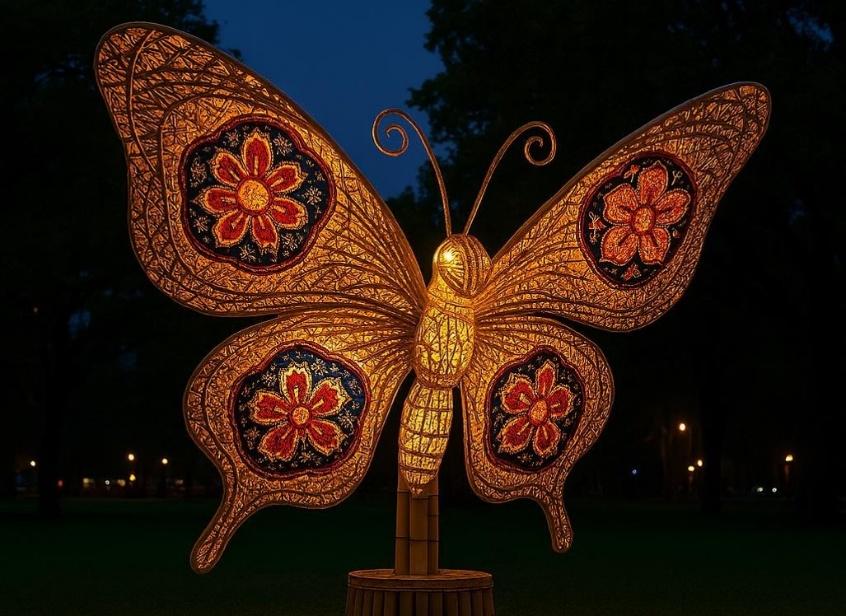 以南投在地竹材與竹編工為主軸的「共榮之光」有竹蜻蜓、蝴蝶等竹編燈組,展現竹材的柔韌與可塑性,同時寓意著社會不同族群相互支持的共榮關係。
