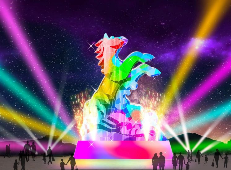 今年有兩座主燈,分別置於天與地,天上代表「凌光之翼」是一座飛馬造型的新主燈,有著金黃色馬身、天藍色馬蹄與雙翅。主燈表演將搭配內部齒輪轉動與音樂旋律,展現馬兒抬腳、揮動雙翅與擺動馬尾的奔騰姿態。