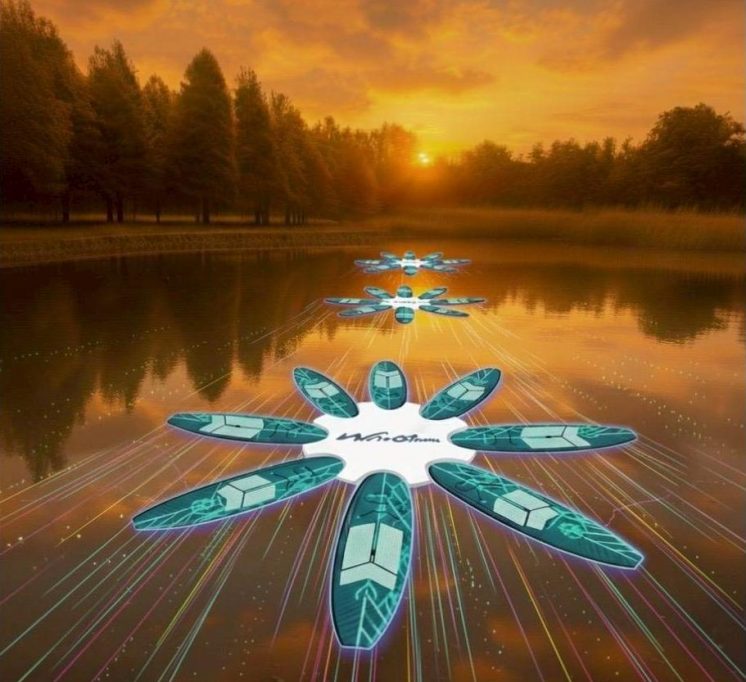 「波光藝境」燈區是以 8 塊 SUP 立槳組成的湖上裝置藝術,夜晚將伴隨著浮台底部彩色 LED 燈光與板身燈條,產生夢幻水面倒影,是展現水域生命力的展區。
