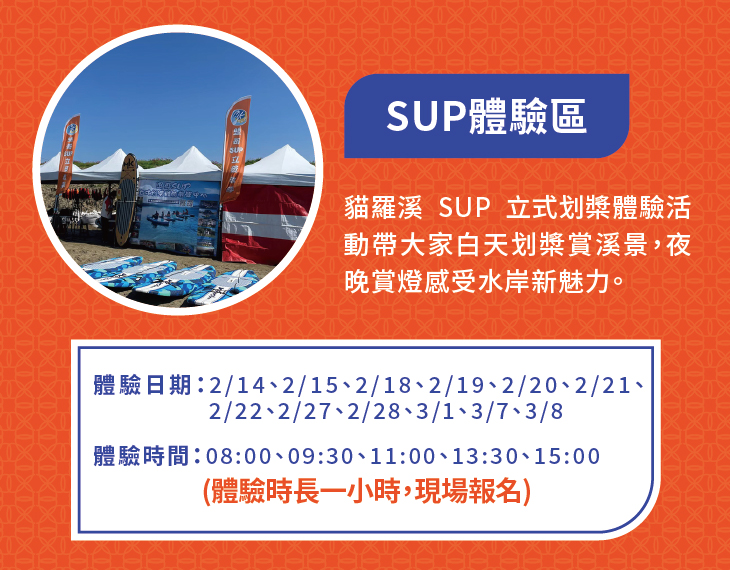 | SUP體驗 報名方式:現場 | 2/14(六)~3/8(日)指定日 08:00、09:30、11:00、13:30、15:00 | 貓羅溪 (近花海區) |