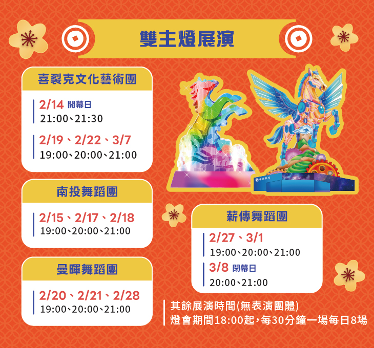 | 2/14(六) (開幕日) | 19:00-19:10 | 南投舞蹈團 |