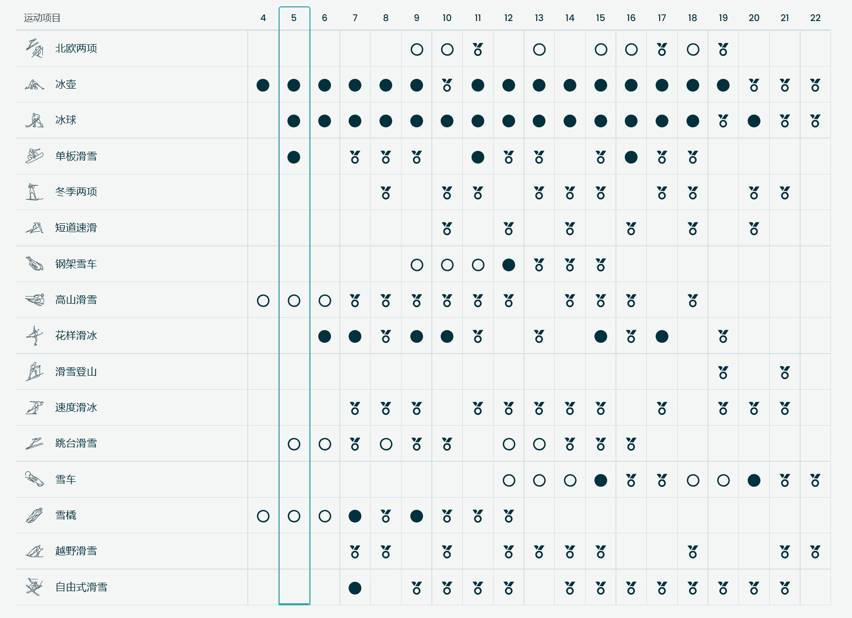 | 競賽項目 | 冬季兩項 雪車 空架雪橇 冰石壺 冰球 雪橇 花式滑冰 短道競速滑冰 競速滑冰 越野滑雪 自由式滑雪 北歐混合式滑雪 跳台滑雪 單板滑雪 滑雪登山 阿爾卑斯式滑雪 |