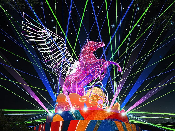 主燈高達 13 公尺,寬 18 公尺,使用 300 個金屬切面搭配銳鵬航太廢料製成,不僅可 360 度旋轉,更採用多軸機械臂製作翅膀,將生動展現飛馬展翅的的姿態。