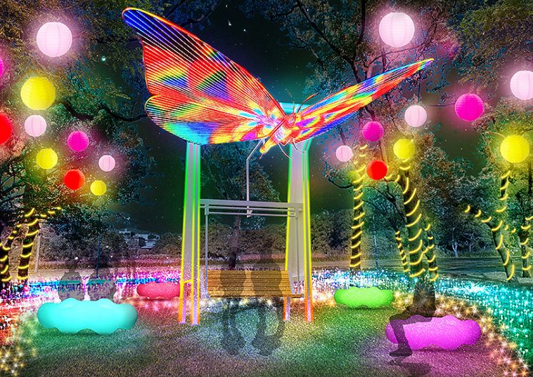 《靚靚桃林》由多個會發光的金屬製桃樹組成,沿著主燈環繞。主燈展演期間,這座裝置將隨之變換燈光律動,如同被喚醒的桃林,與主燈一同演出。