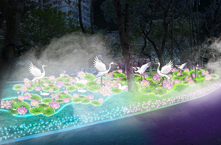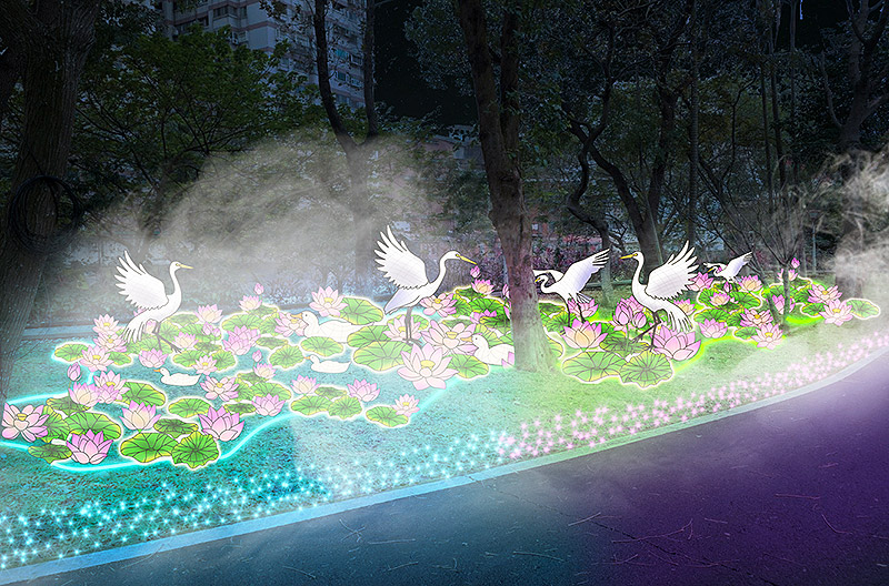 在這可見綠稙金色拱門、鑽石森林、彩色海芋、白色木馬、白鷺鷥、荷花池、河馬、水鴨等燈組。