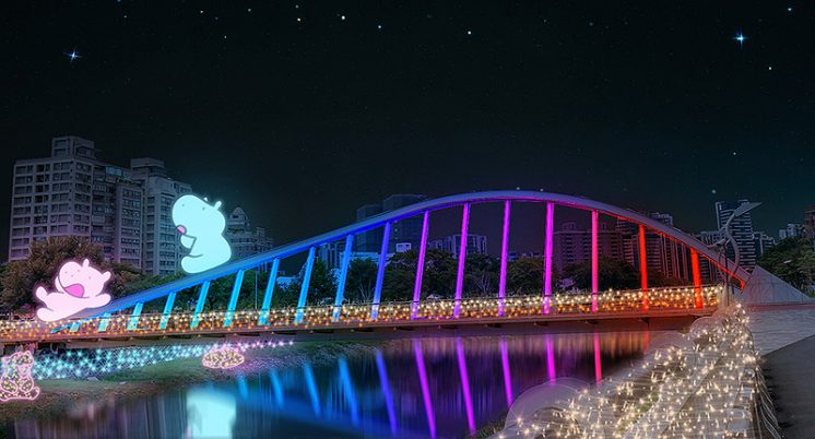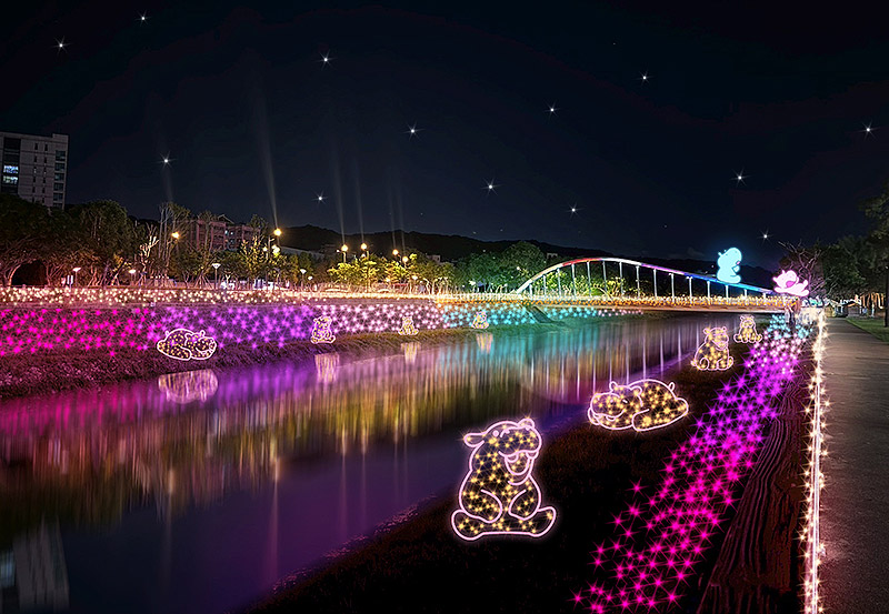 青溪橋設有兩隻可愛河馬氣偶,與水面上發光燈飾相映,從陸上到水上都閃爍著璀璨光芒。
