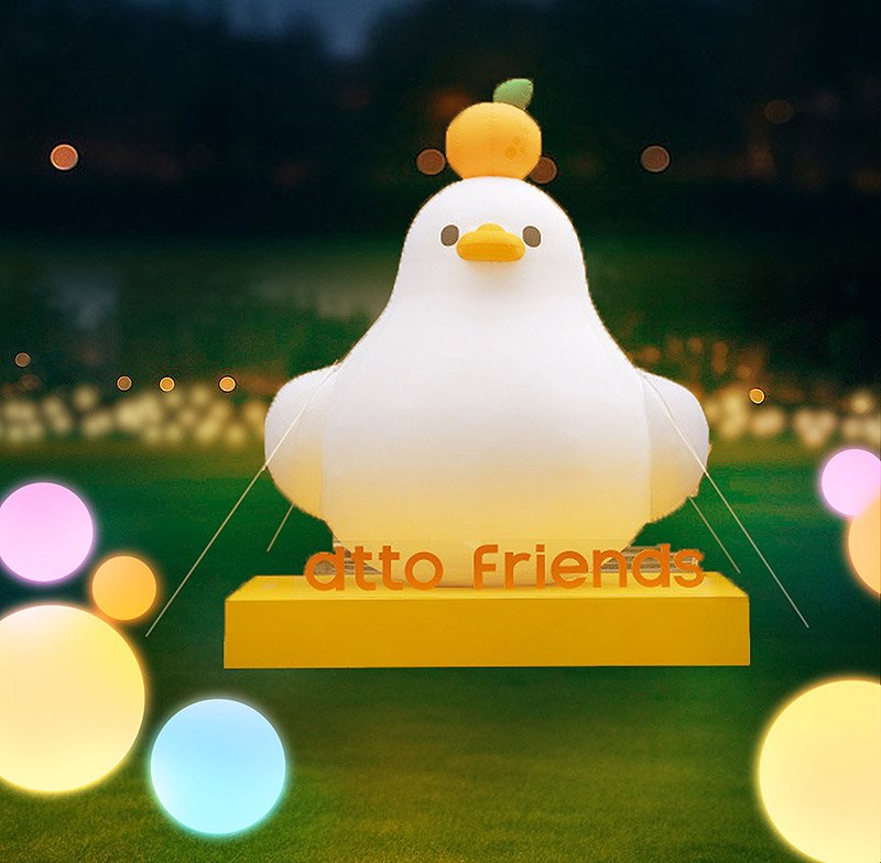 「dtto friends樂園」位在三民運動公園,是以 Dcard IP 為主題的燈區,可見狗狗 Dinu、鴨子 Hoya、腸太郎等 10 組可愛角色燈組。