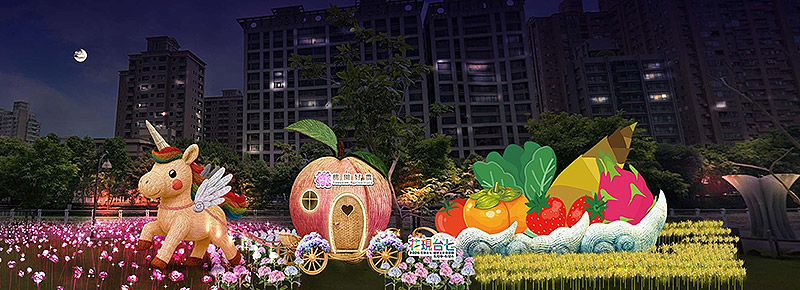 今年桃園農業局更打造了《馬力十足》燈組,可見獨角飛馬拉著水蜜桃馬車、竹筍、番茄、草莓、火龍果與柿子前行,傳遞永續農業精神。