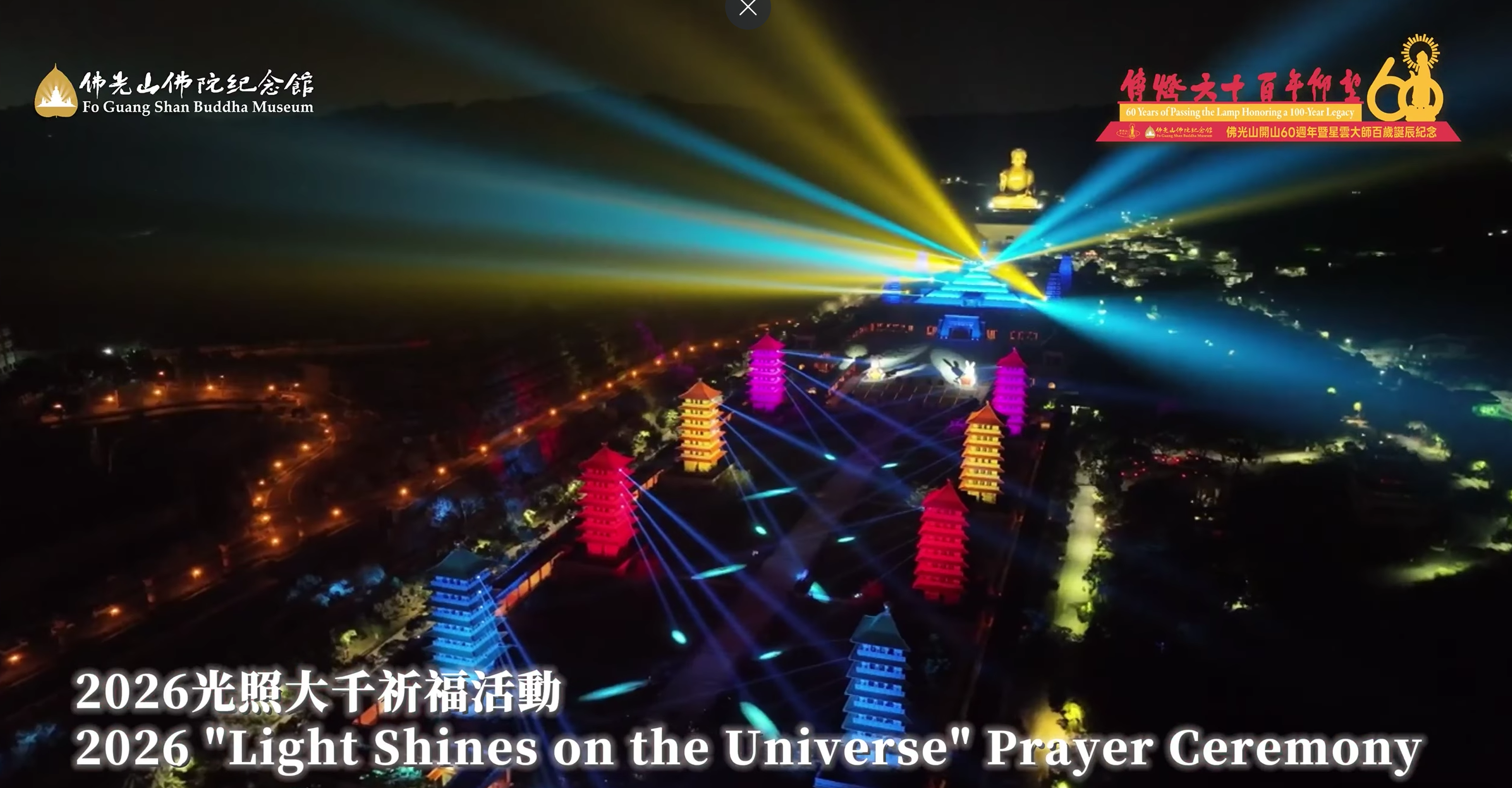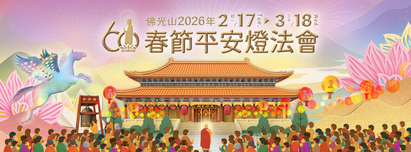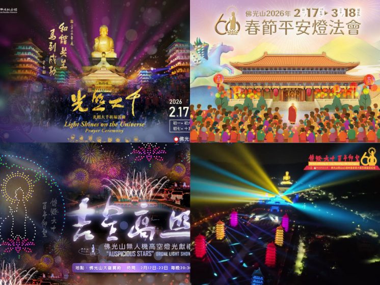 高雄佛光山將在 2026 年 2 月 17 日至 3 月 18 日舉行「2026佛光山春節平安燈法會」,今年逢佛光山開山 60 週年,法會以「傳燈六十.百年仰望」為主題,將展開為期一個月的燈會活動。