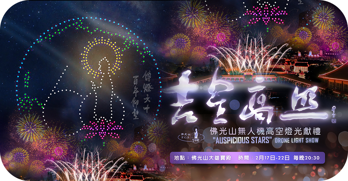 | 2026吉星高照 - 無人機高空燈光獻禮 | 2/17(五)~2/22(日) | 每晚 20:30 | 大雄寶殿成佛大道 |