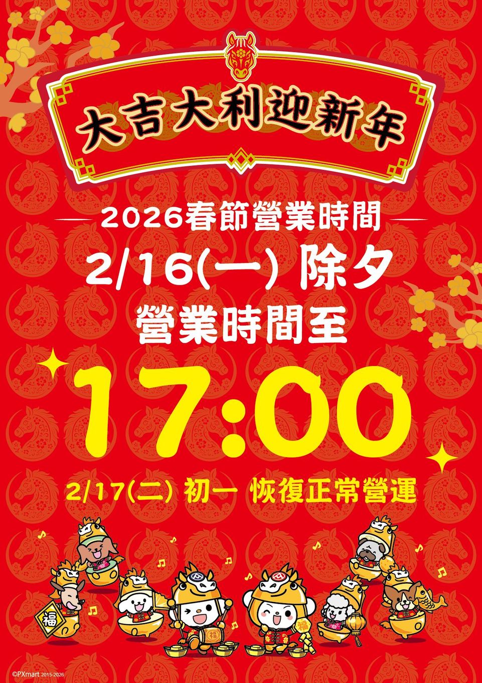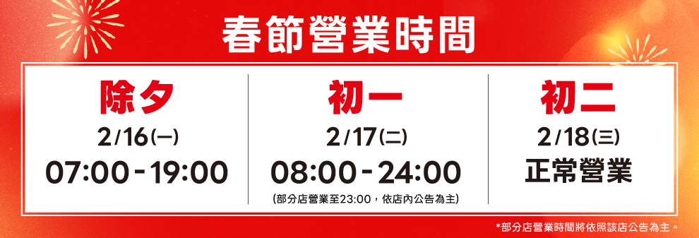 | 2026/2/17(二)初一 | 08:00-24:00 (部分分店營業至23:00) |