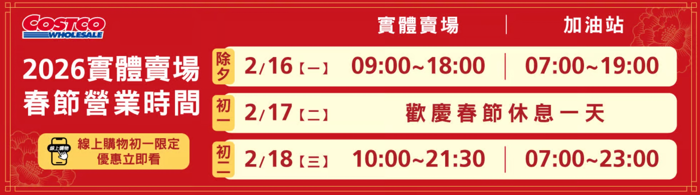 好市多已公告 115 年春節營業資訊,實體賣場除夕早上 9 點開始營業,晚上 6 點關店;初一不營業,初二上午 10 點至晚上 9 點 30 分營業。