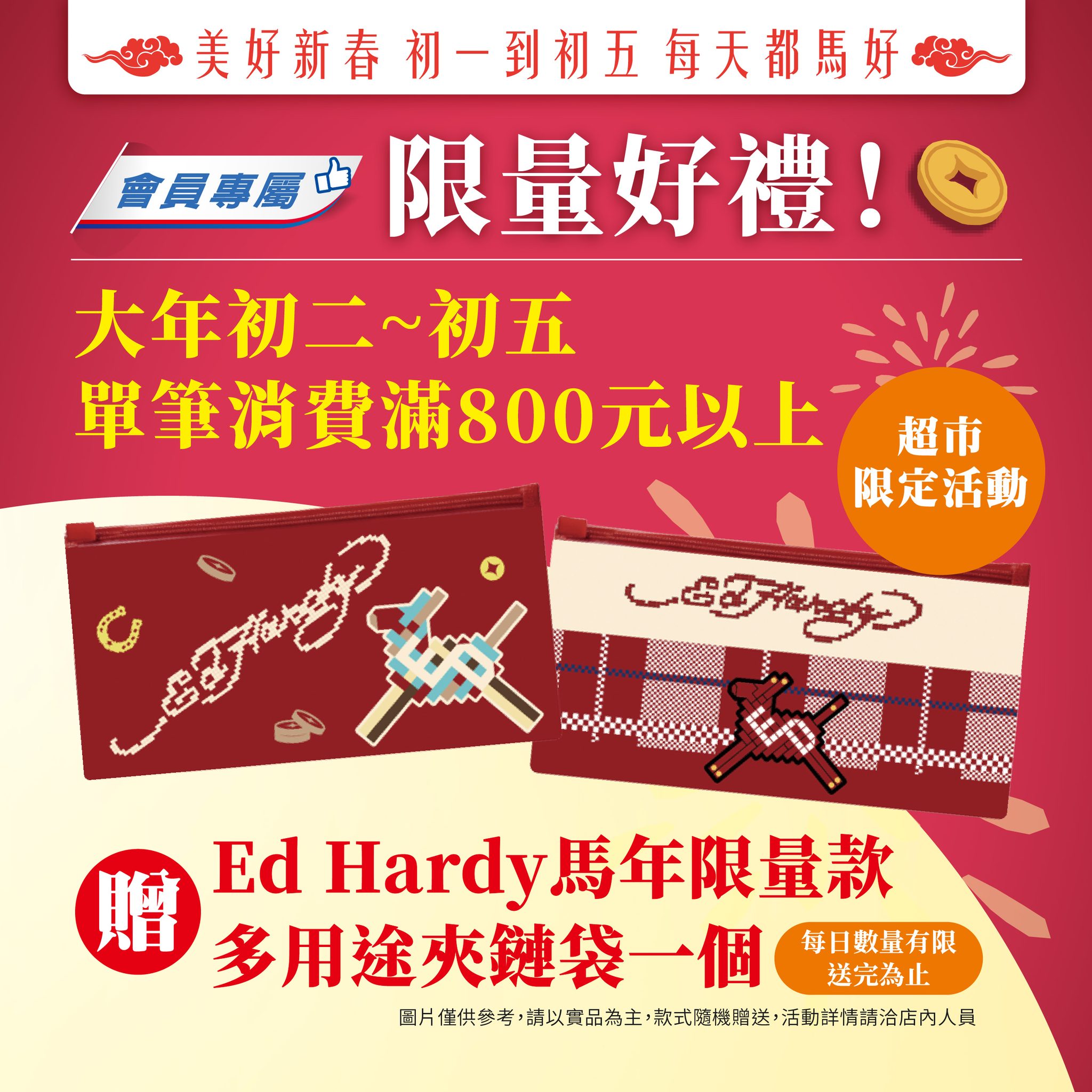 大年初二至初五在家樂福消費滿 800 元以上,就送Ed Hardy 馬年限量款夾鏈袋;2/4~2/16 在賣場消費滿 2400 元,可抽 20 吋行李箱、保溫杯、手提袋、折扣碼好康優惠等。👉活動詳情