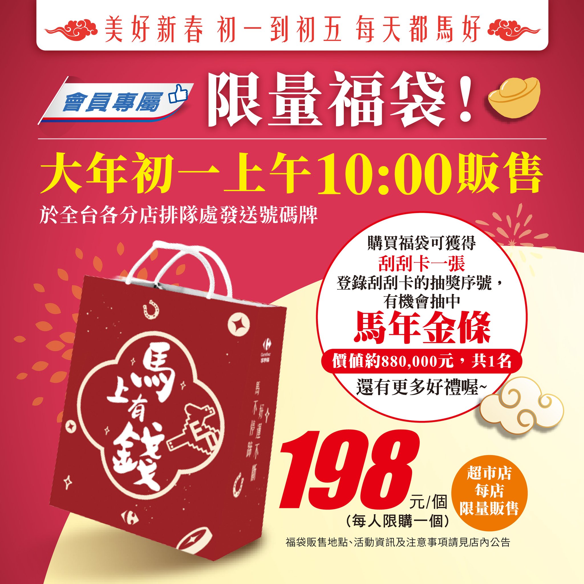 家樂福春節福袋也將在 2/17 大年初一開賣,大獎是價值 88 萬元的馬年金條,另有行李箱、保溫袋等好禮 ! 每袋 198 元,內含茶裏王四季春茶、杯麵、八寶粥、家福蛋酥花生等零食飲料組合,隨袋附贈刮刮卡、開春優惠券各 1 張,家樂福會員可於當天上午 10 點於現場領取號碼牌購買。
