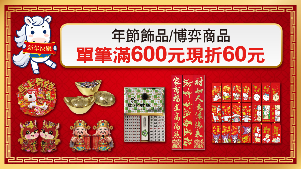 1/14~2/24 到愛買紅包袋、春聯、斗方、掛飾、糖果等過年商品,滿 600 元可折 60 元,最高折 300 元;線上購物推出春節折扣,全館 92 折 92 折起,APP 下單享6%回饋,還可以抽購物金。