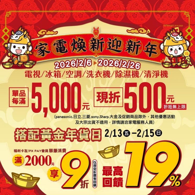 大全聯過年 2/6~2/26 推出「家電換新迎新年」優惠活動,買電視、冰箱、冷氣、洗衣機、清淨機、除濕機滿 5000 元現折 500 元;2/13~2/15 福利卡有、PX Pay 會員滿 2000 元享 9 折,最高享19%回饋。👉優惠商品|過年DM
